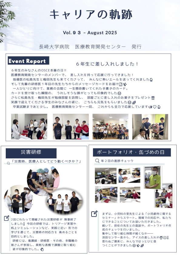 医療教育開発センターでは、定期的にミニコミ誌「キャリアの軌跡」を発行。長崎大学病院の研修プログラムの特徴や、研修医の活躍などについて紹介しています。ぜひ、ご覧下さい。