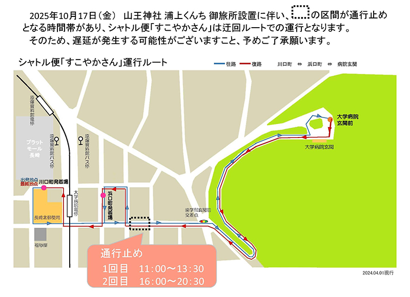 お知らせ 2025/10/3 10月17日(金)浦上くんちに伴う通行止めによる シャトル便「すこやかさん」の運行ルート変更の お知らせ 2025年10月17日(金) 山王神社浦上くんち御旅所設置に伴い、一部の区間が通行止めとなる時間帯があり、シャトル便「すこやかさん」は迂回ルートでの運行となります。 そのため、遅延が発生する可能性がございますこと、予めご了承願います。