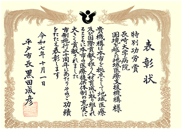 2025年10月1日(水)、平戸文化センターで開催された平戸市市制施行20周年記念式典において、長崎大学病院「国境を越えた地域医療支援機構」が特別功労賞を受賞しました。