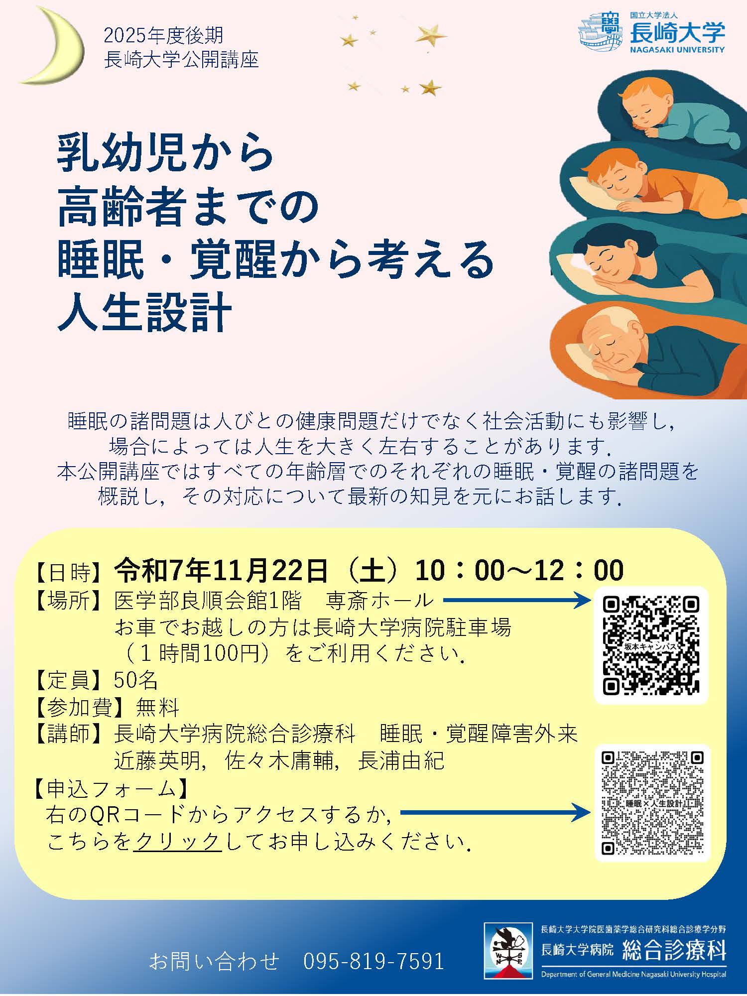 本公開講座ではすべての年齢層でのそれぞれの睡眠・覚醒の諸問題を概説し、その対応について最新の知見を元にお話します。