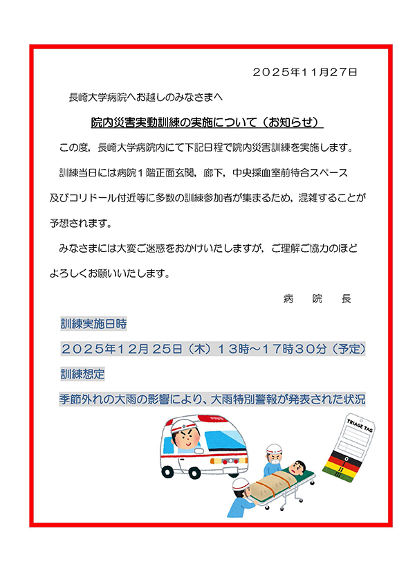 お知らせ 2025/12/8 院内災害実動訓練の実施について この度、長崎大学病院内にて下記日程で院内災害実動訓練を実施します。 訓練当日には病院1階正面玄関、廊下、中央採血室前待合スペース及びコリドール付近等に多数の訓練参加者が集まるため、混雑することが予想されます。みなさまには大変ご迷惑をおかけいたしますが、ご理解とご協力のほどどうぞよろしくお願いいたします。 ■ 訓練日時 2025年12月25日(木) 13時~17時30分(予定) 【添付ファイル】ポスター