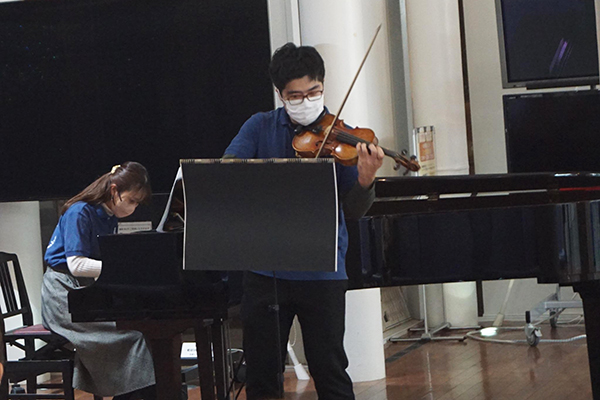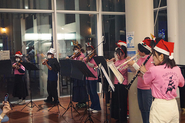その後、医学部1年生から6年生までの約40名で10グループに分かれて出演し、「アメイジング・グレイス」や「ジングルベルロック」、「戦場のメリークリスマス」など、クリスマスムードあふれる全10曲を演奏しました。