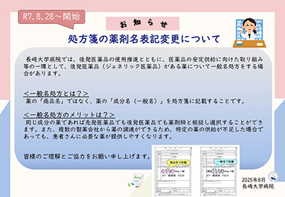 本院ではR7.8.28から、後発医薬品の使用推進とともに、医薬品の安定供給に向けた取り組み等の一環として、後発医薬品(ジェネリック医薬品)がある薬について一般名処方をする場合があります。