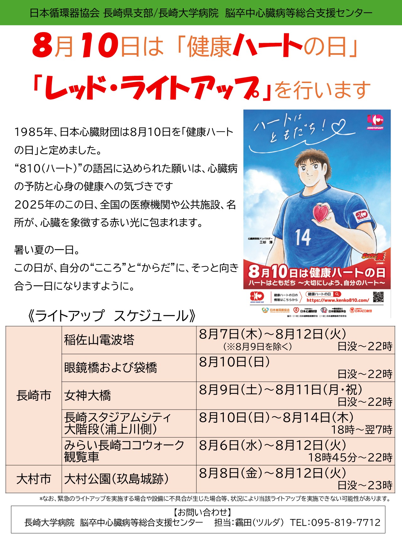 日本心臓財団は、1985年より毎年8月10日を「健康ハートの日」と定め、様々な一般市民向けの心臓病予防啓発イベントを行っています。その一つとして、全国各地の名所や施設等をハートの色である「赤」にライトアップしています。 今年はハートの日設立40周年という特別な節目の年で、下記の名所や施設等において、ライトアップする予定です。ぜひ、この赤くライトアップされた名所や施設をみて、ご自身や家族の心臓について考えるきっかけにしてもらえればと思います。