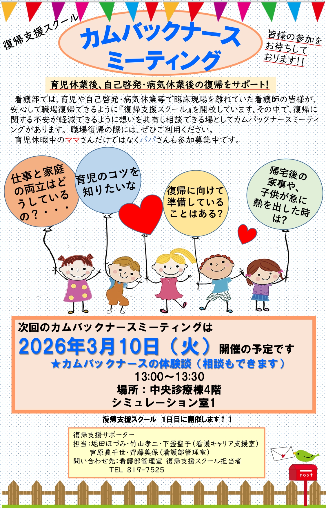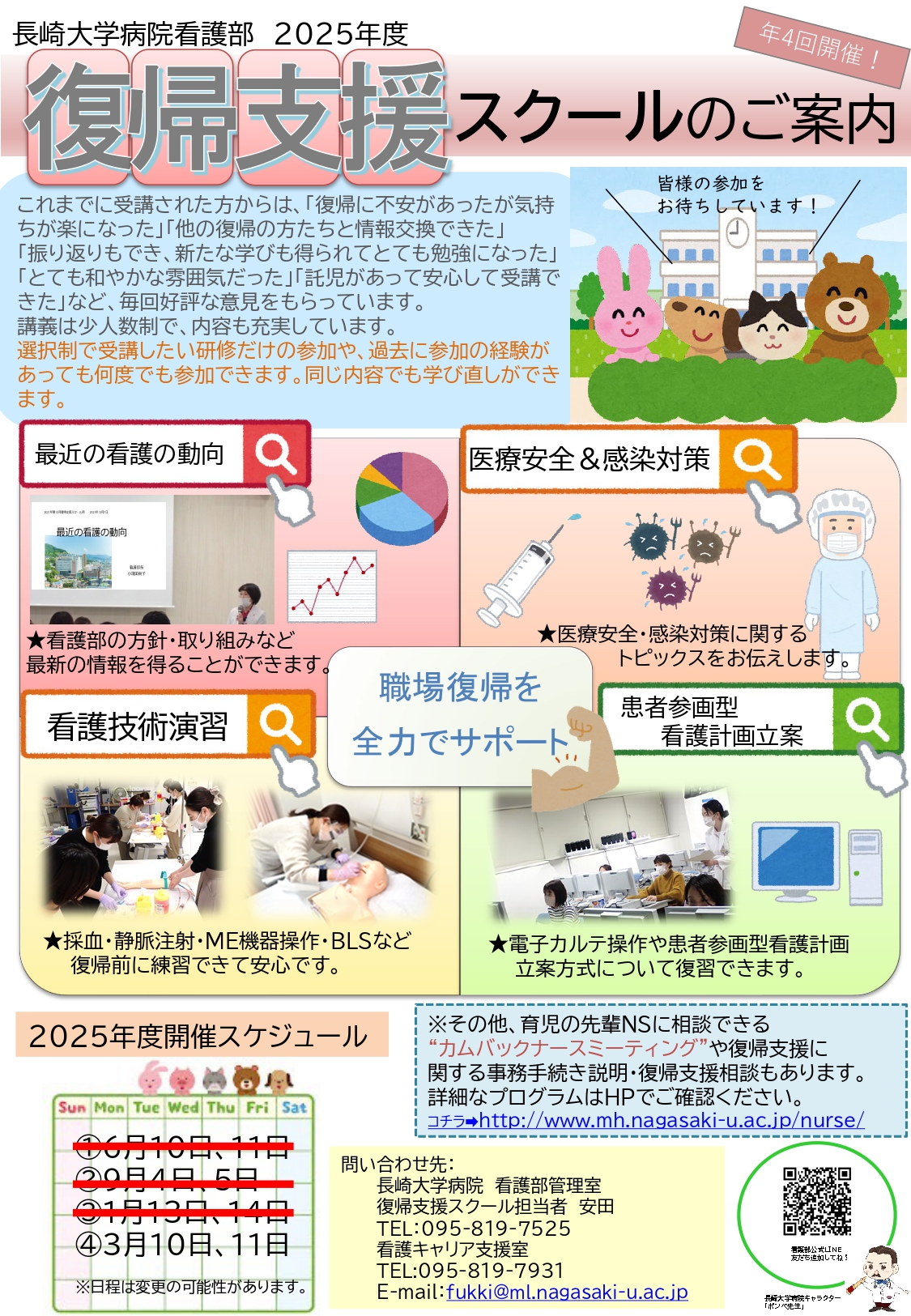 長崎大学病院看護部では、育児休業、自己啓発休業、病気休業、出向などで、しばらく病院から離れていた看護師のみなさんが安心して職場復帰できるような応援プログラムとして『復帰支援スクール』を行っています。