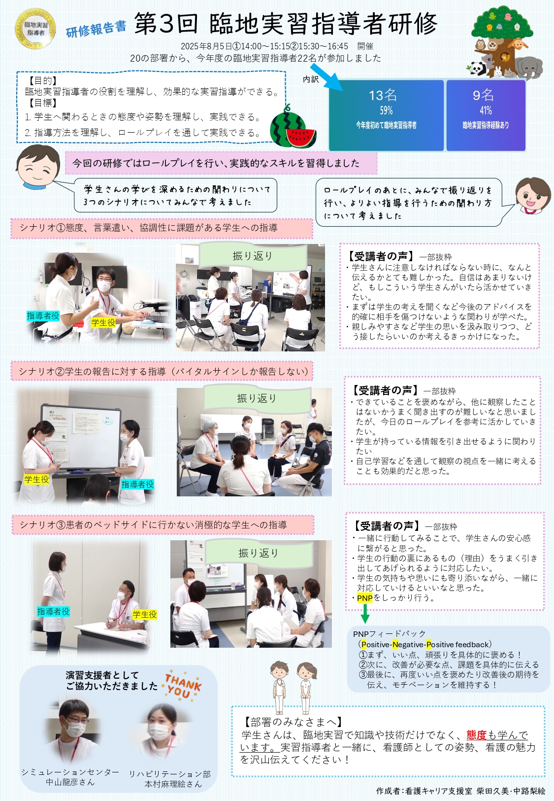 学生指導を行う臨地実習指導者を対象に、8月5日に第3回臨地実習指導者研修を行いました。