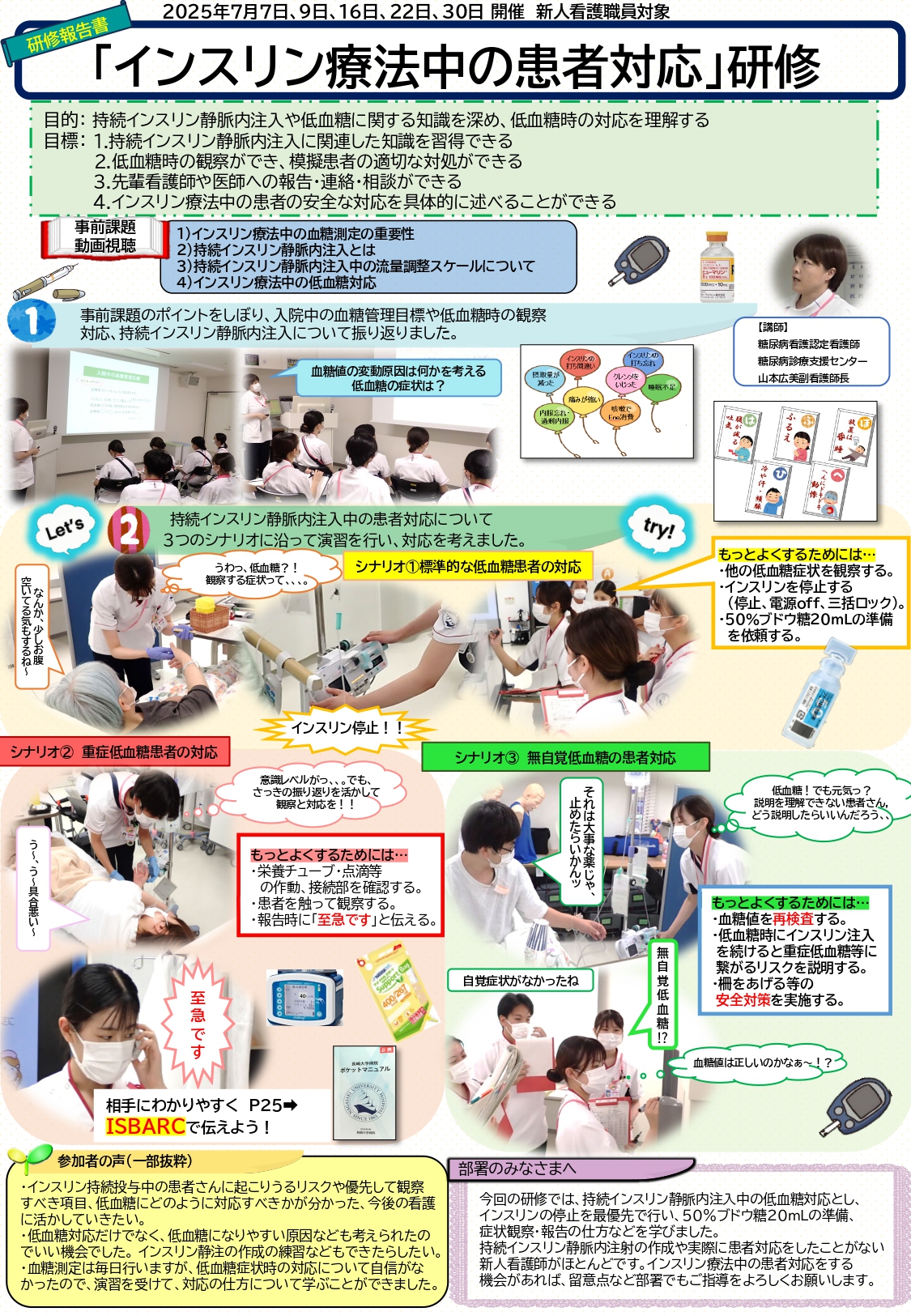 7月7日、9日、16日、22日、30日に新人看護師を対象に「持続インスリン静脈内注入や低血糖に関する知識を深め、低血糖時の対応を理解する。」を目的として
