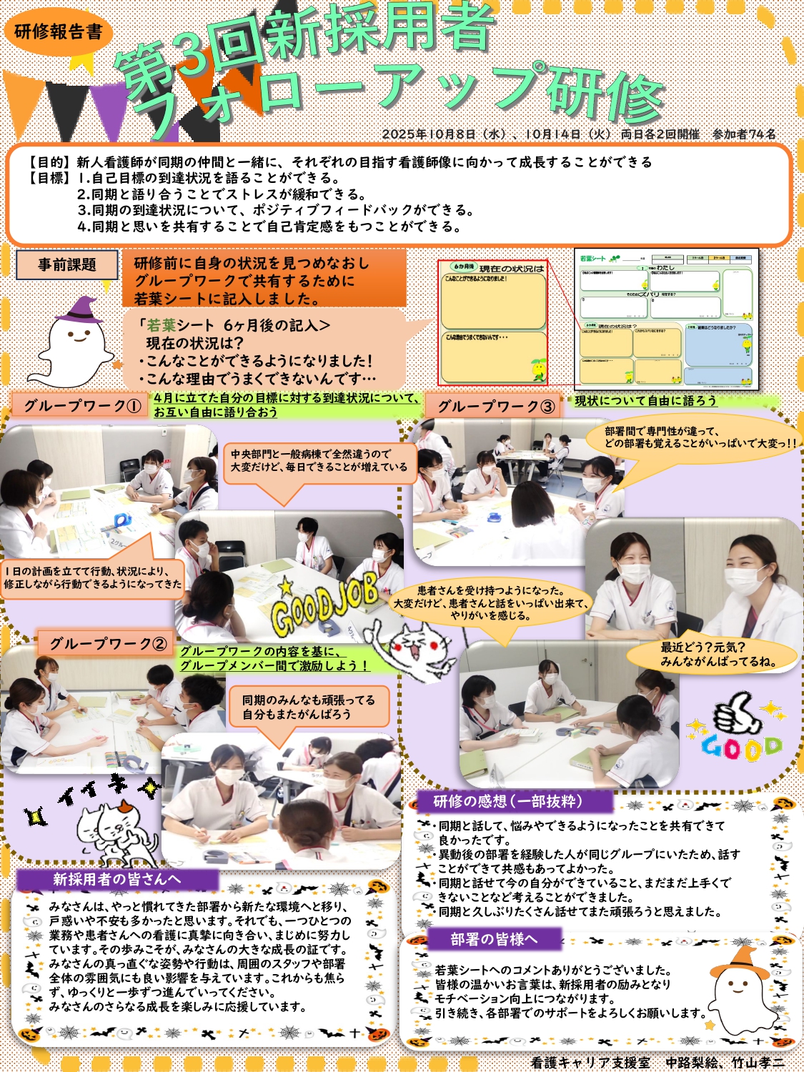 10月8日、10月14日に開催しました新人看護師が同期の仲間と共にそれぞれが目指す看護師像に向かって成長することを目的に研修を開催しました。研修では、同期同士で現状の到達度を共有し合い、互いに励まし合うことで「これからも頑張っていこう」という前向きな気持ちを再確認しました。さらに、緊張やストレスを和らげることにもつながりました。